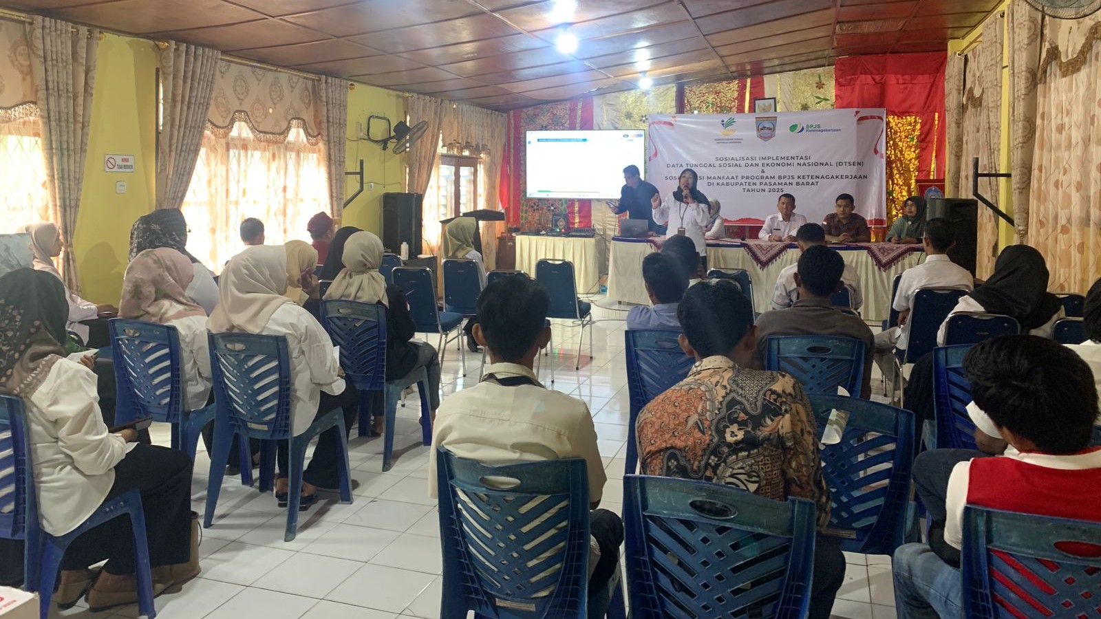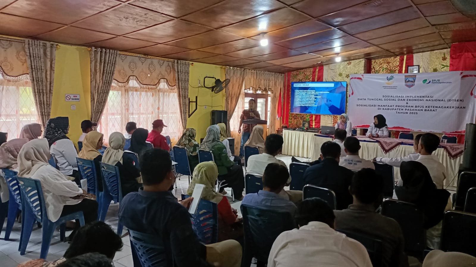 Sosialisasi ini dilaksanakan pada Rabu tanggal 15 Oktober 2025 bertempat di Aula Kantor Camat Talamau, dengan Narasumber Kepala Dinas Sosial Pasaman Barat Randy Hendrawan, S.I.P., M.Si. dan Kepala Kantor Cabang BPJS Ketenagakerjaan Pasaman Barat Ana Rizqi Toyyibah. Peserta sosialisasi terdiri dari Wali Nagari/Perangkat Nagari, Bamus, Jorong se-Kecamatan Talamau, Operator SIKS-NG Nagari dan Pendamping PKH.